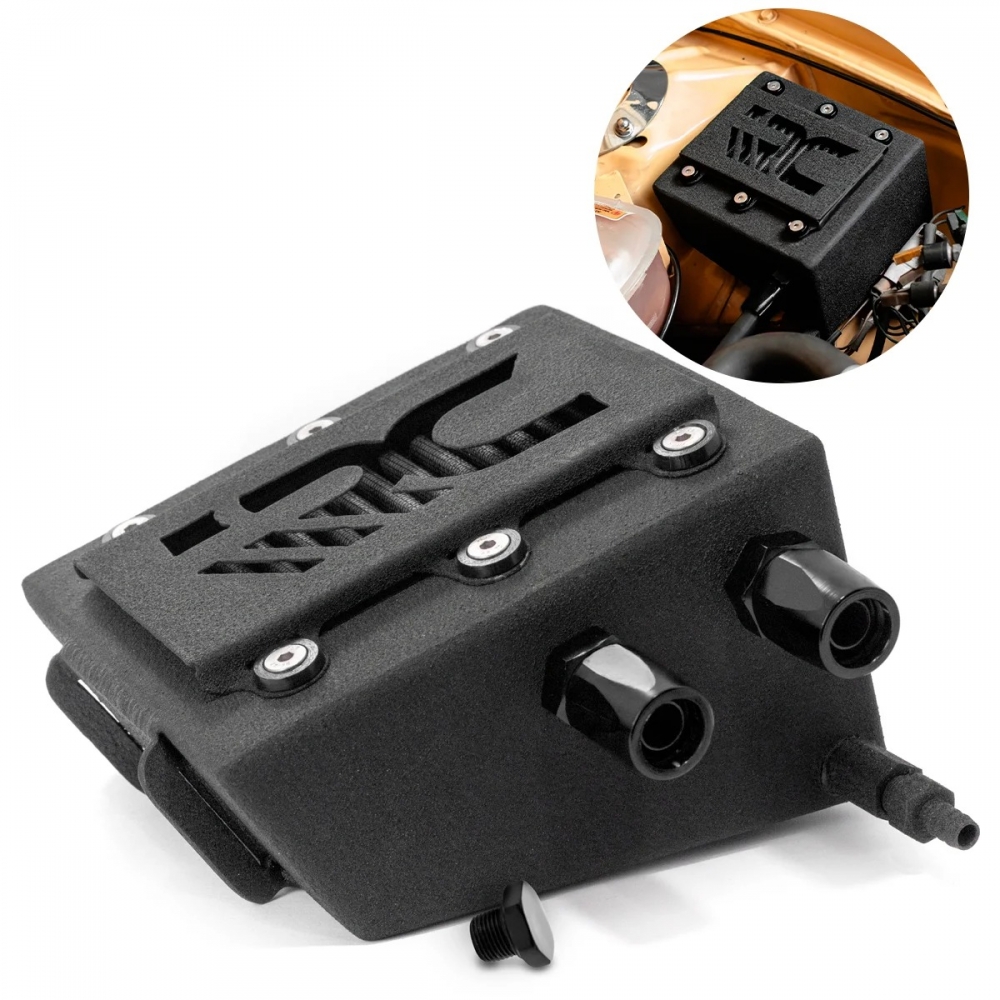 Fabricado em alumínio com defletor de óleo interno (corta onda) que possui como principal função tirar a pressão interna dos gases que chega do motor no reservatório, separar o óleo do combustível e evitar o balanço excessivo dos líquidos dentro do compartimento do reservatório, desta forma retém todo excesso de óleo liberando somente a passagem do vapor de ar do motor pelo filtro de saída de gases.
