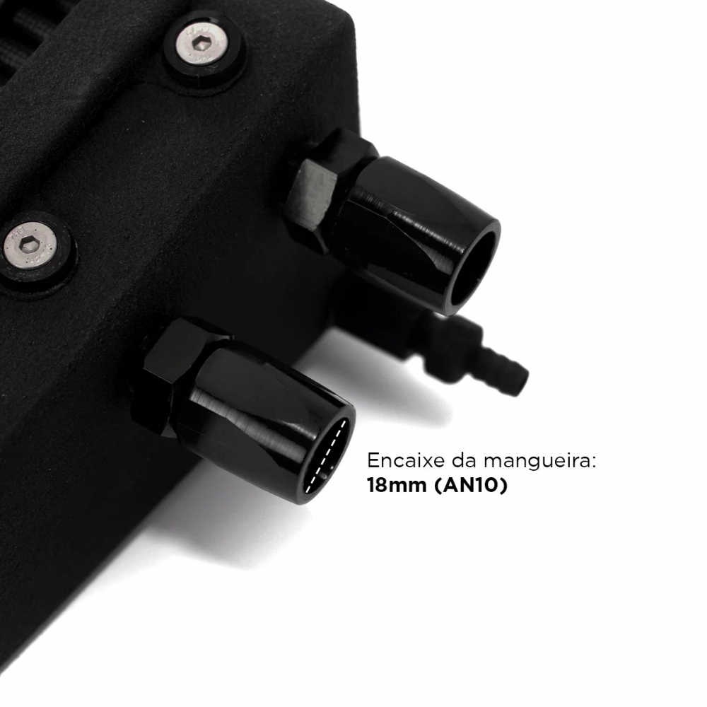 Na parte de vazão de ar acompanha duas conexões externas AN10 para encaixe em mangueira flexível com 12,7 mm (½”) de diâmetro de vazão interna com até 19.0mm (3/4”) no diâmetro externo, conexões fabricadas em CNC com alto padrão de acabamento e qualidade de vedação em 100% dos líquidos e ar que vem do motor.